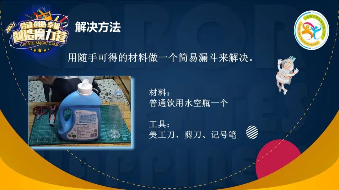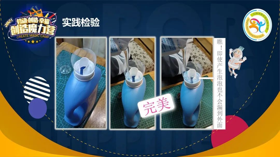 他们用普通的饮料瓶制作了一个简易漏斗。按照洗衣液瓶口的大小将饮料瓶的瓶口剪掉一部分,将剪好的饮料瓶漏斗套在洗衣液瓶上,就可以方便地把补充液倒进去了。你要不要也来试试呢?