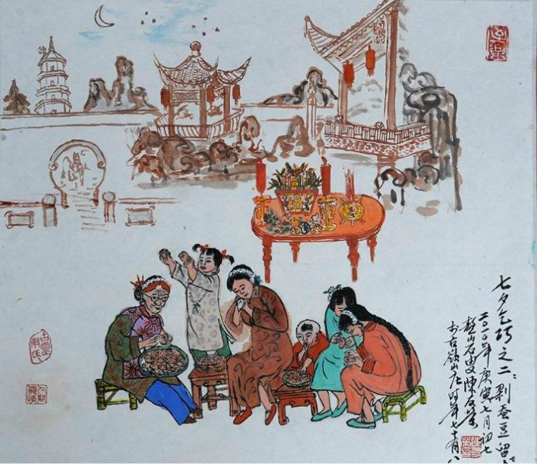 晚上,家人朋友们一同坐在庭院中纳凉,品尝瓜果菱藕。妇女姑娘们在月下比赛穿针,如果可以穿过七个大小不同针眼的人,被称为“巧”。小朋友坐在一起,听着长辈们讲牛郎织女的故事,抬头看着牛郎织女鹊桥会,颇有闲情诗意。