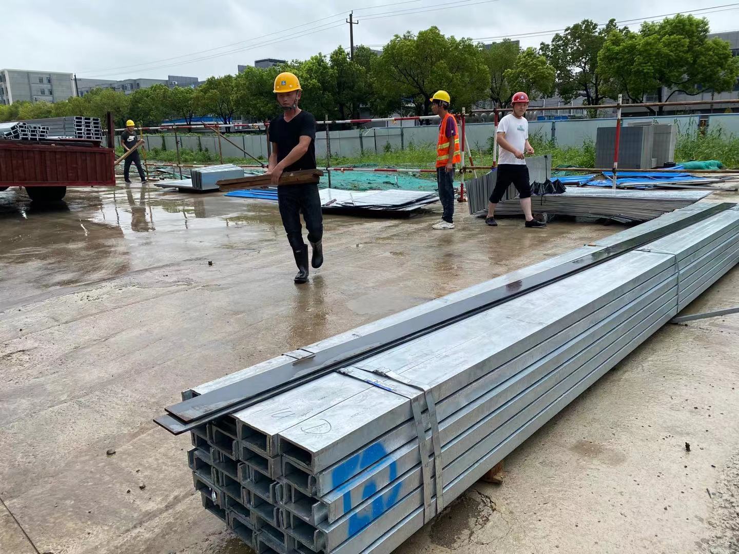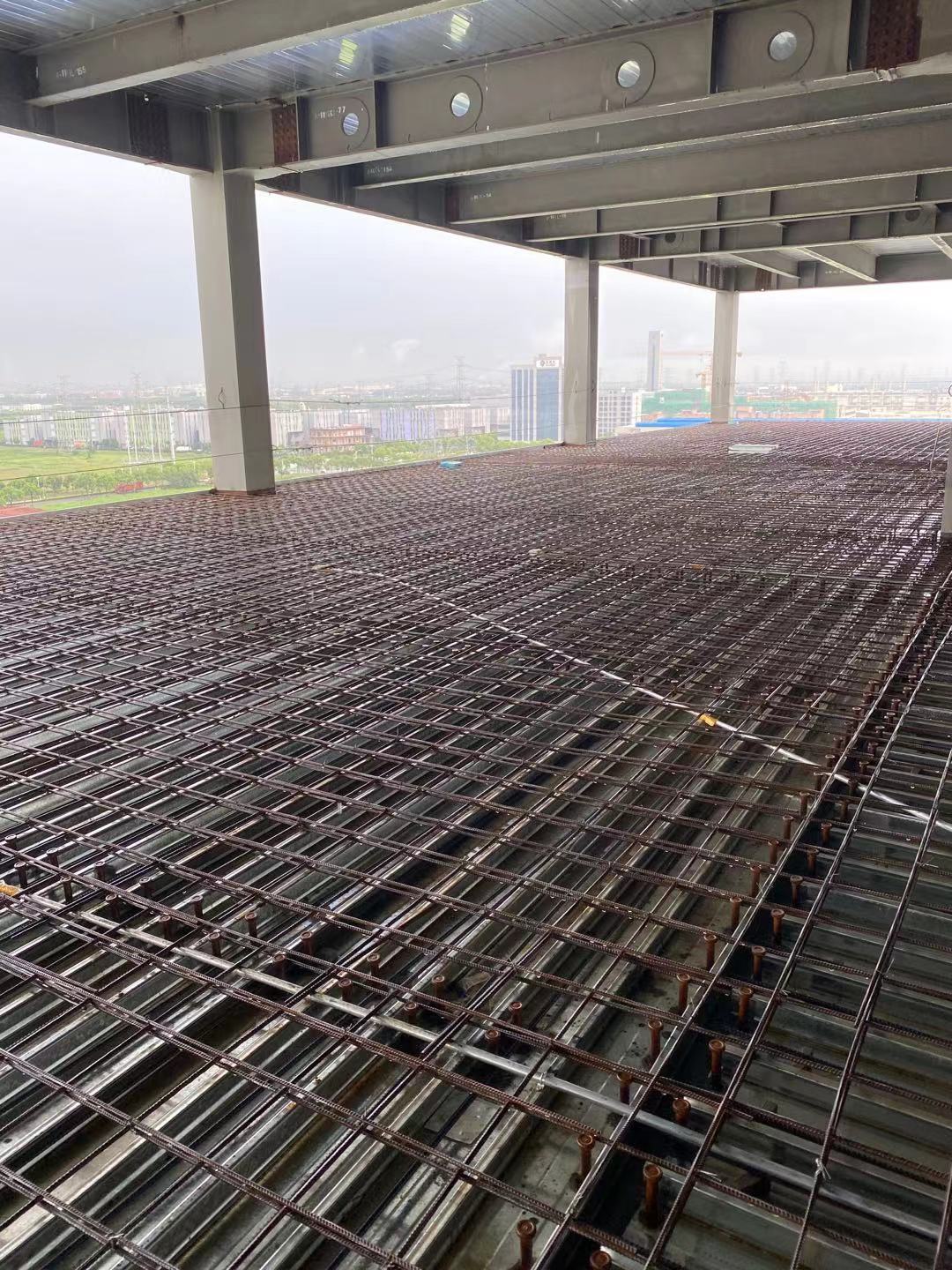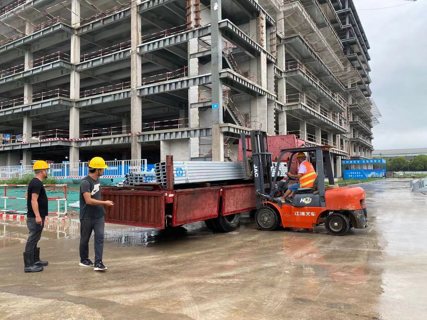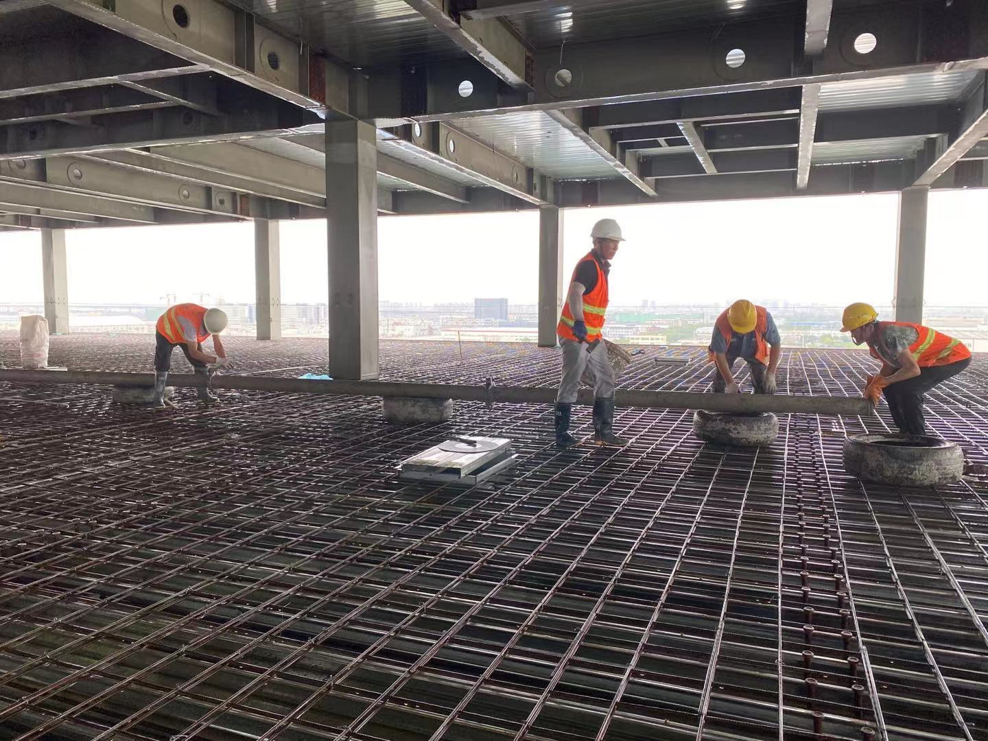 两幢建筑均采用钢结构和玻璃幕墙结构。乘坐施工电梯来到其中一幢建筑物的高层,只见地面铺设着楼板和绑扎好的钢筋,4名工人正在安装泵管,混凝土将通过泵管浇灌到钢筋框架中。“高温天我们调整了施工时间,上午从5点半到10点半,下午从2点半到6点半,也为工人们准备了藿香正气水、绿豆茶等防暑降温用品,保障高温天气下的正常施工。”张福磊说。