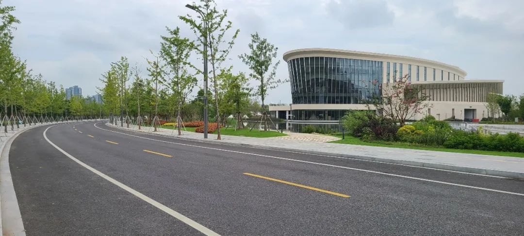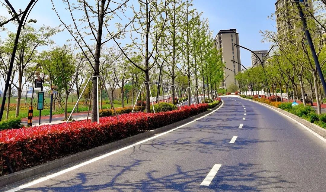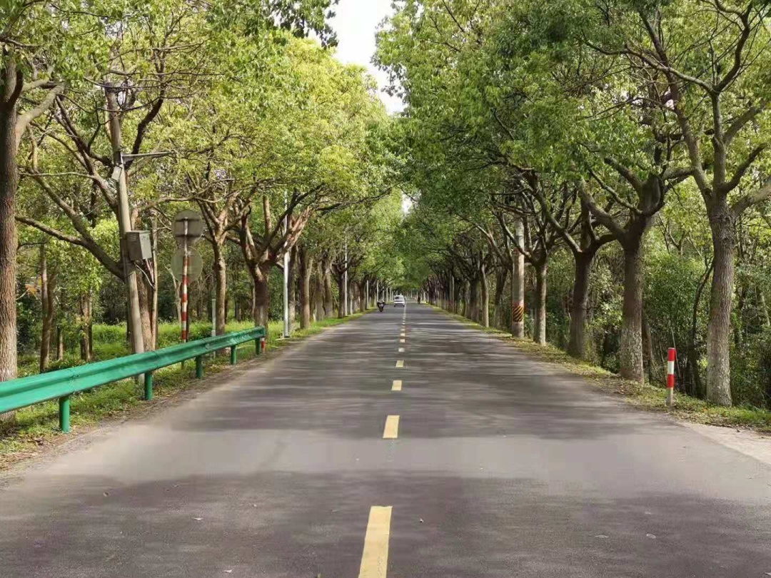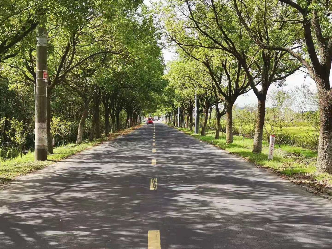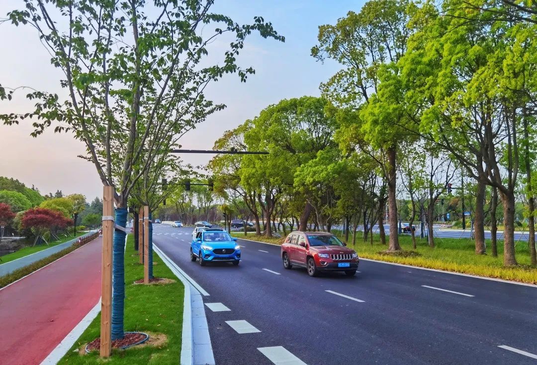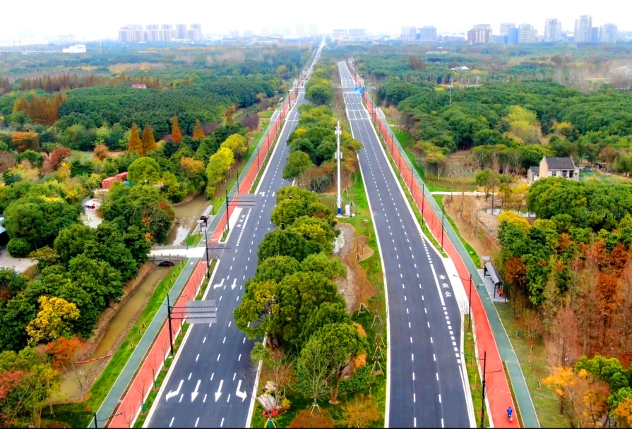 望园路(金齐路—航南公路)全长1.8公里,位于奉贤区中央生态林地片区,建设时保留了现状水系和大树林地,非机动车道和人行道分别采用红色、绿色彩色沥青,宛如腰带,系于绿林,是奉贤全要素打造交通和生态融为一体的森林大道。