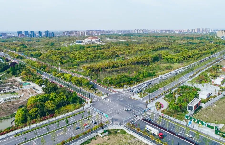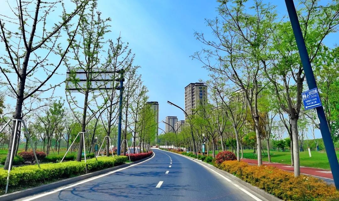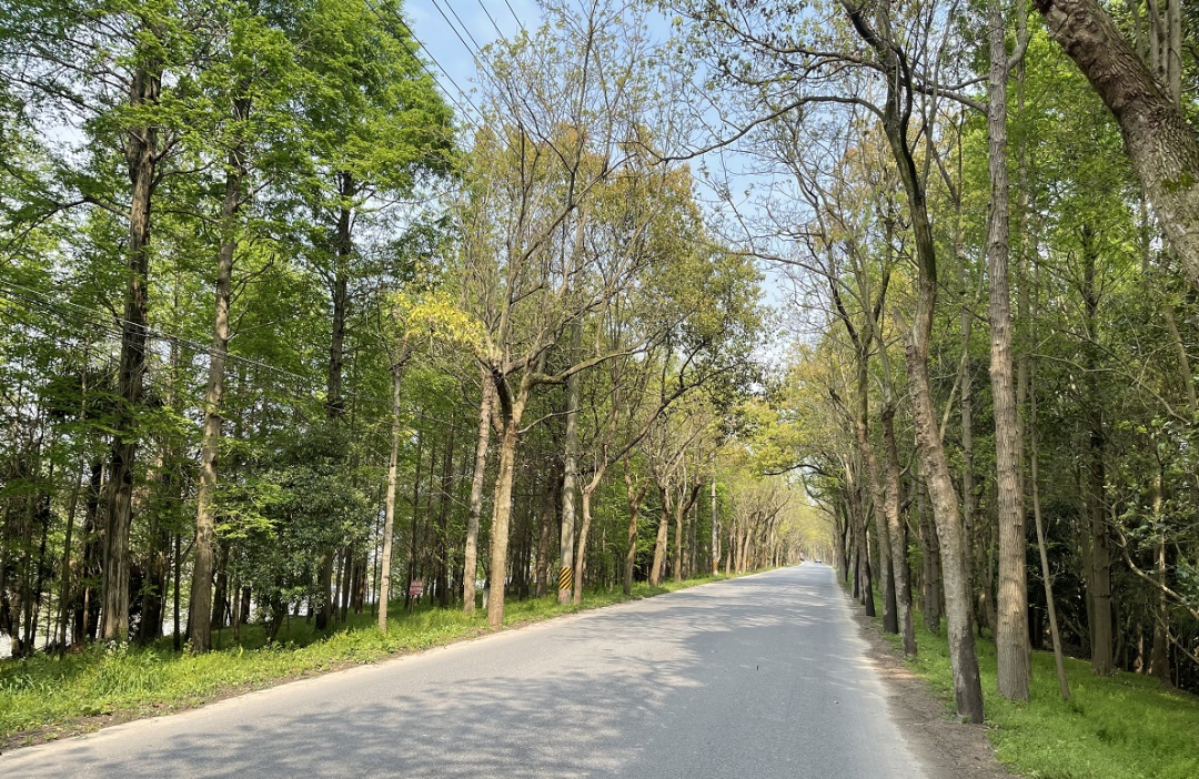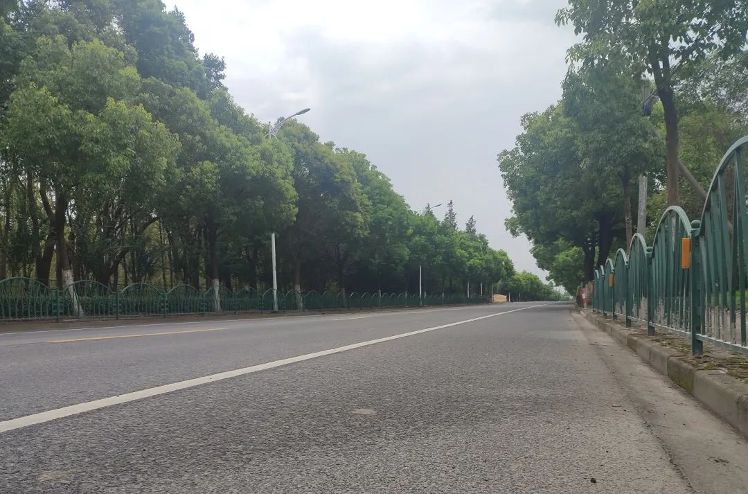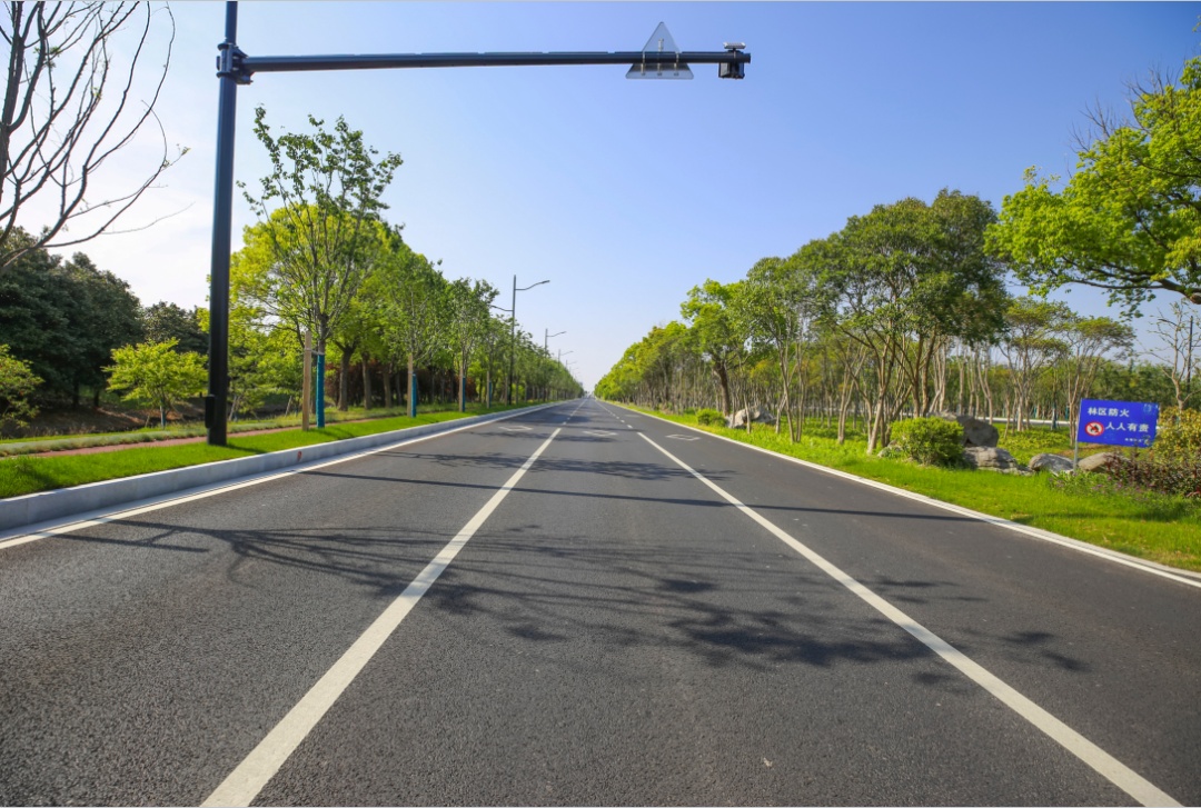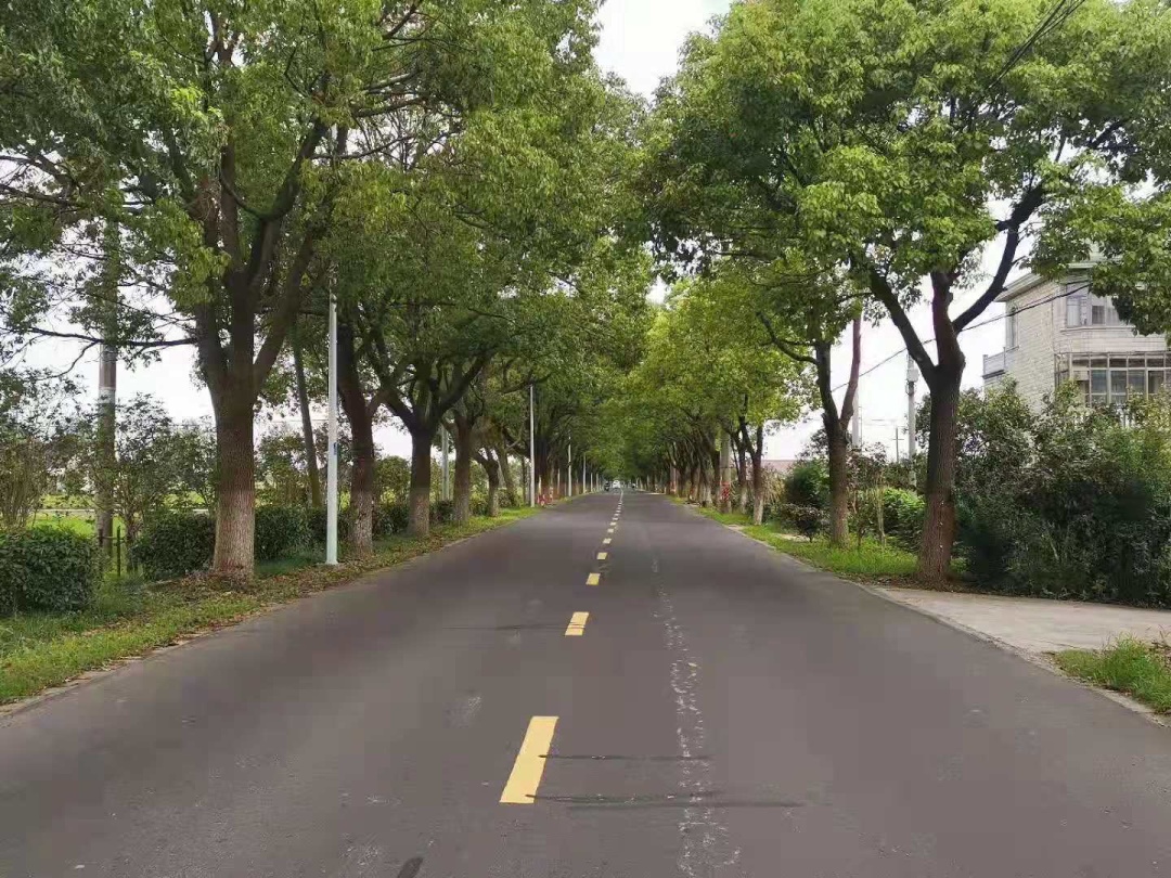 望园路(金齐路—航南公路)全长1.8公里,位于奉贤区中央生态林地片区,建设时保留了现状水系和大树林地,非机动车道和人行道分别采用红色、绿色彩色沥青,宛如腰带,系于绿林,是奉贤全要素打造交通和生态融为一体的森林大道。