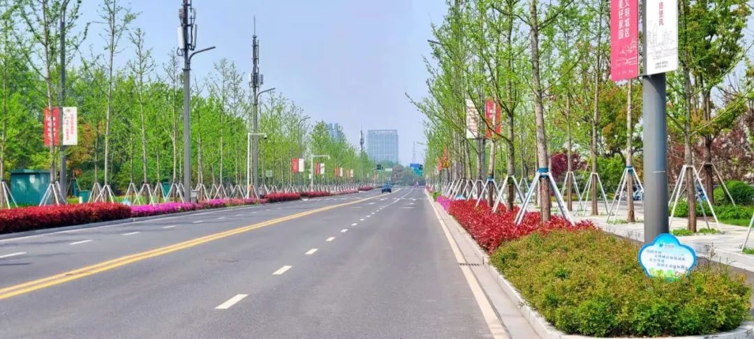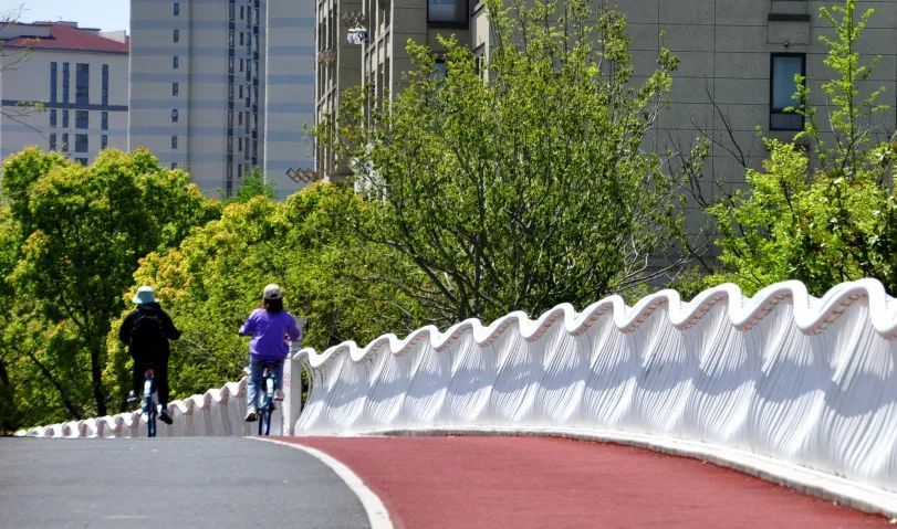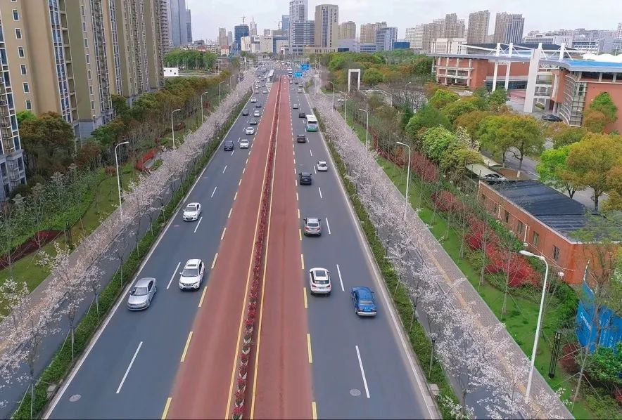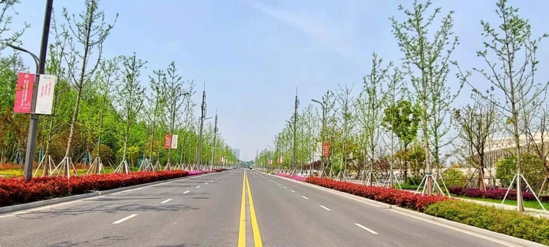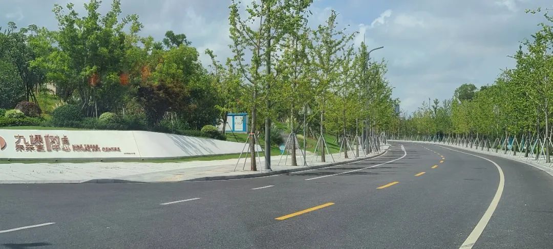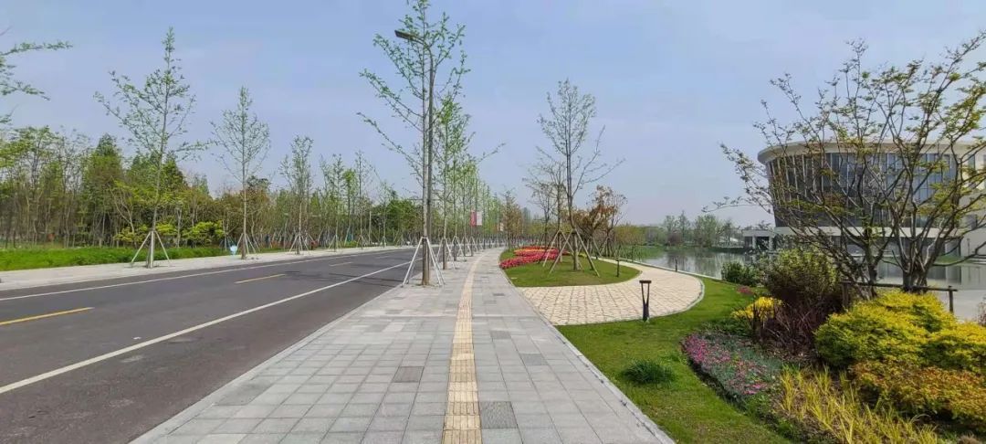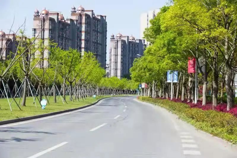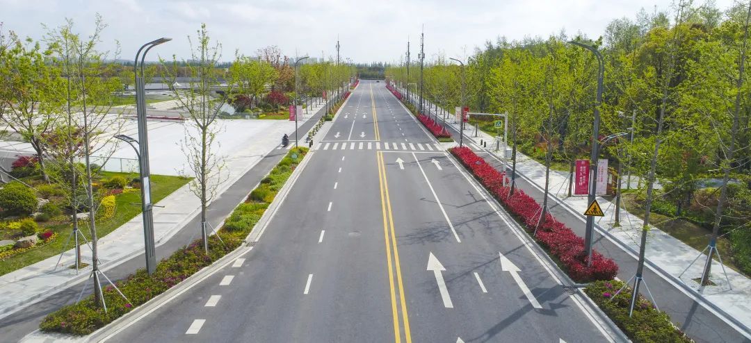 望园路(金齐路—航南公路)全长1.8公里,位于奉贤区中央生态林地片区,建设时保留了现状水系和大树林地,非机动车道和人行道分别采用红色、绿色彩色沥青,宛如腰带,系于绿林,是奉贤全要素打造交通和生态融为一体的森林大道。