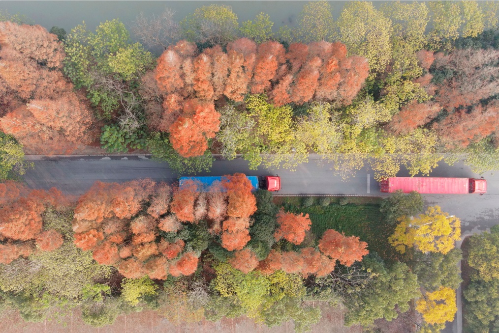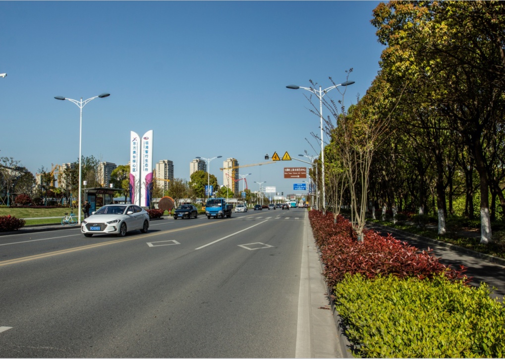 年丰路位于S4高速南桥出口,东侧是奉贤地标“城市客厅”的上海之鱼,道路宽阔平整,宽宽的中央绿化隔离带种满银杏、朴树、香樟,树木成荫、枝繁叶茂。秋季时分,金灿灿的银杏叶缀满枝头,与环湖大道湖堤路、秀竹路、湖畔路连成生态大道。