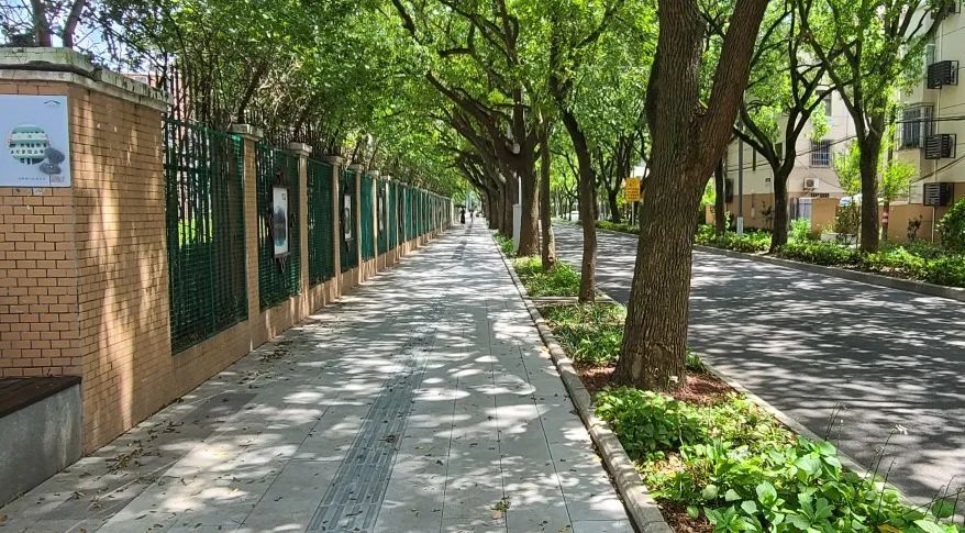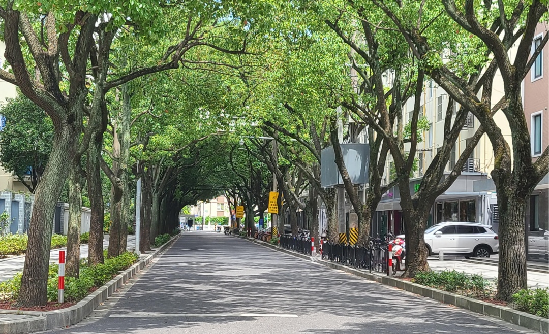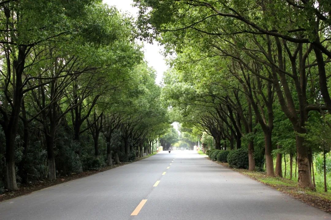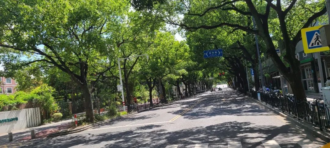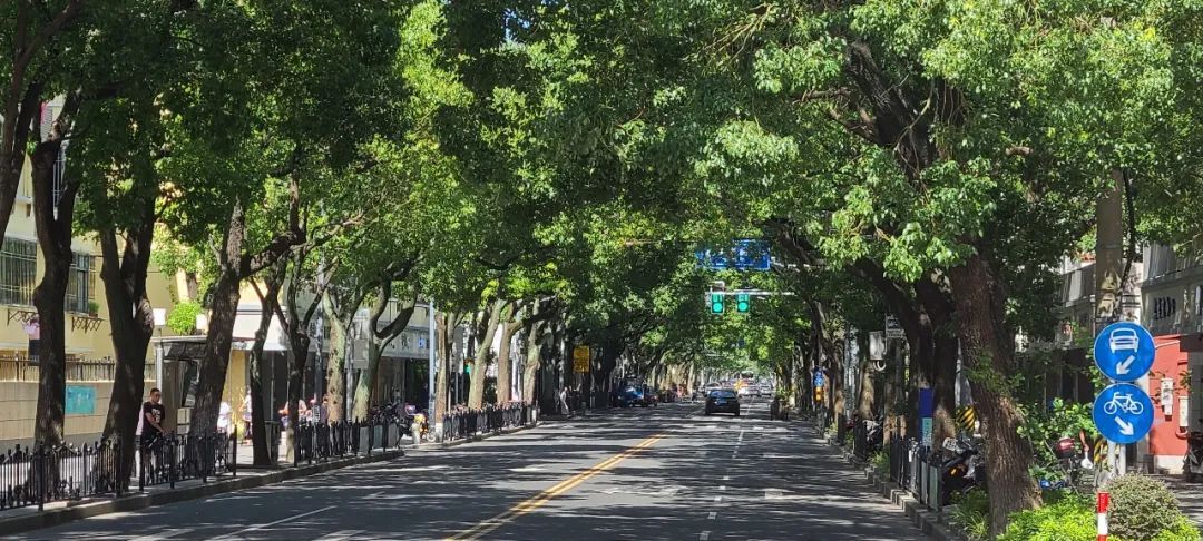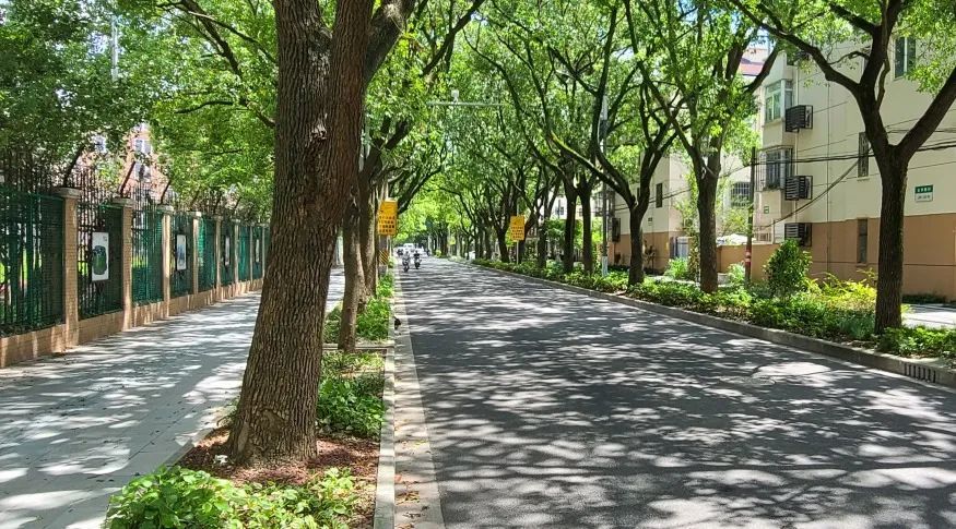 郁郁葱葱的行道树相向而立,构架出一个弧形的穹顶,像一把结实的太阳伞,为路过的行人们遮蔽烈日,踏着树荫下一地的剪影,吹着习习凉风,这应该是人们最享受的生活吧。