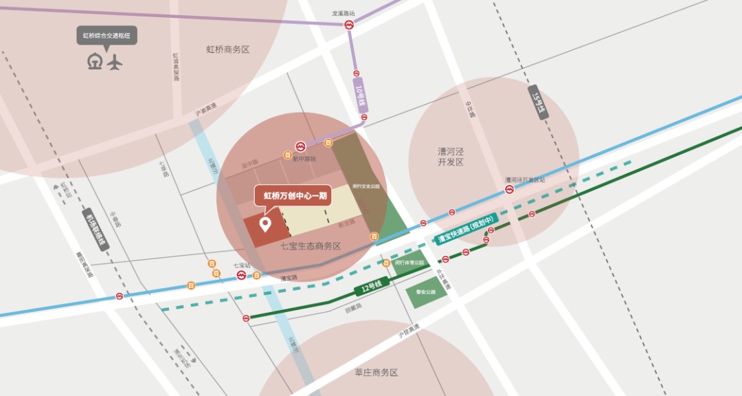 虹桥万创中心一期地处上海西南门户,位于七宝生态商务区核心地带,毗邻九星城、中春路板块,北邻虹桥商务区、东接漕河泾开发区、南靠莘庄商务区,占据园区生态链核心位置,周边密布成熟的立体交通网络,三条地铁线路环伺周边,虹桥枢纽短时可达。
