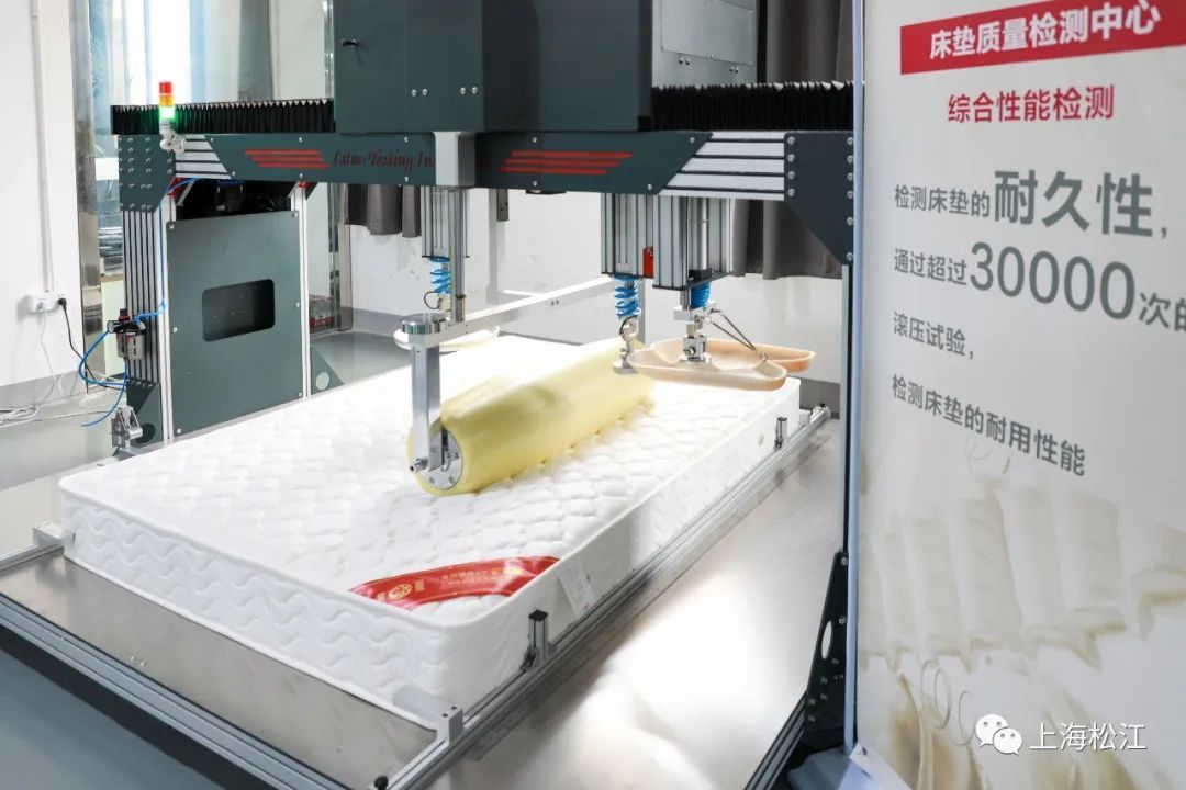 此外,车间还设立了床垫质量检测中心,根据综合性能、物理性能和环境检测三个方向分别设立独立检测室,这也是目前上海床垫生产制造企业中唯一一家拥有检测中心的工厂。小松在综合性能检测室看到,每一款床垫上市前,都要通过超30000次的耐久性能抗压试验,只有品质过关的,才能进入市场。