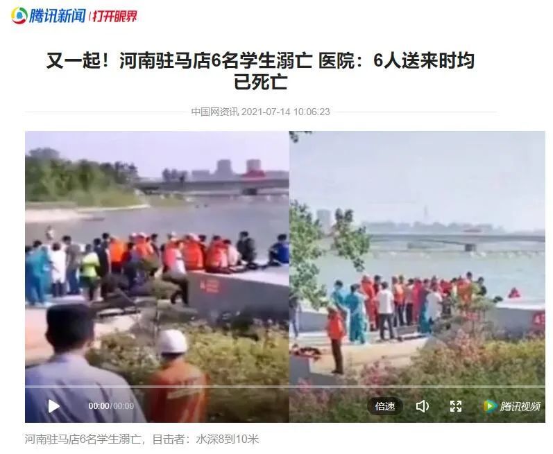 7月13日,河南驻马店6名学生在公园内溺水,在被送往医院时已经确认身亡;