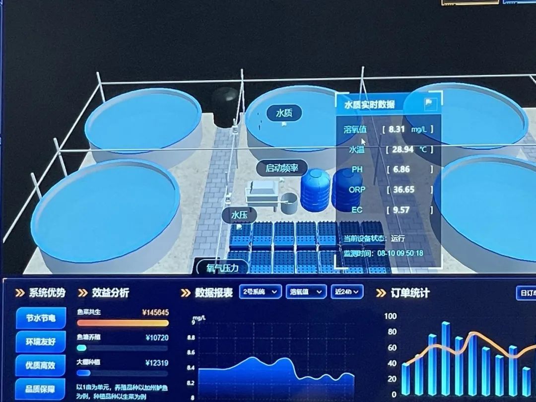 理事长刘永军介绍,基地目前使用了一套自己研发的系统平台来实现智能化、数字化、集约化管理。在一块屏幕上就能对整个“鱼菜共生”系统进行监控和管理。在每套鱼菜系统中都装有一个“魔盒”,实现对大棚内空气温度、水溶氧量、pH值等数据的实时监控,各类数据第一时间被发送到云平台。一旦某一项指标出现问题,便开启自动报警,管理人员收到信息后可以第一时间采取措施。此外,手机上也有App,管理人员可以随时随地监控基地运行情况,这套系统解决了管理者的日常烦恼。