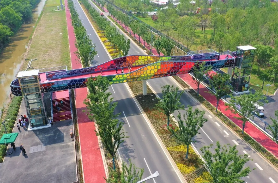 无论是来崇明的游客,还是长期居住在本地的老百姓,都不禁感叹——崇明的路变宽了。花博会开幕前夕,崇明多个道路新建和改建工程先后竣工投入使用,优化了崇明内部交通组织,完善了“四横七纵”骨干路网系统,改善了群众的出行条件。以陈海公路为例,作为崇明岛内快速抵达花博园区的主要交通干道,陈海公路在花博期间开辟出公交专用道缓解交通压力,中段由“双向4车道+硬路肩”通过重新划设标线改为“双向6车道”;东段取消机非隔离带,由“4快2慢”改为“6快2慢”,并设置9处人行天桥缩减交叉口。9座人行天桥选取梅花、牡丹、莲花、月季、水仙、茶花、桂花、兰花、杜鹃9种花卉作为装饰主体,凸显中国传统花卉文化,兼具实用与美观。