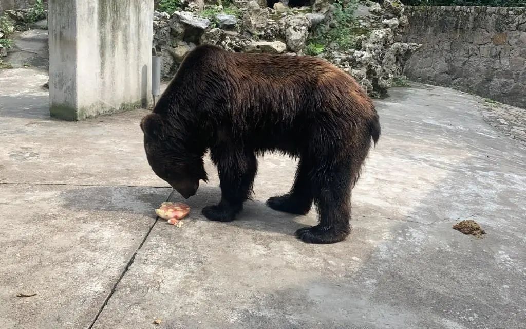 马来熊是杂食性动物,而且是有什么吃什么。饲养员把一小部分西瓜制成冰块。马来熊们在展区内细咬慢嚼地吃着西瓜冰,偶尔来泳池里玩耍一番,别提多滋润了。