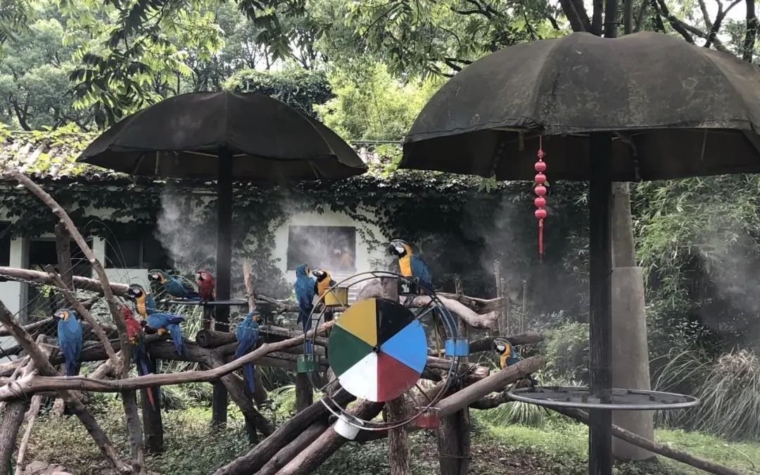 笼舍的室外顶部都安装有喷淋系统,今年热带鸟馆、金刚鹦鹉、企鹅、犀鸟展区更换了喷淋头,将原来水滴状喷头改为了雾状喷头,更为细腻的水雾在微风的吹拂下能覆盖到展区更多的空间,有效减低空气温度,并且不会在地面形成积水影响植物生长。