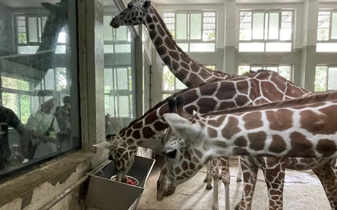 展区内长颈鹿们看到了饲养员手中的西瓜顿时来了精神,西瓜被投入料槽,长颈鹿们开始“狼吞虎咽”地用舌头卷起西瓜送入口中,炎热的感觉随即消散,接下来就靠长颈鹿们自己通过反刍来细细品尝啦!