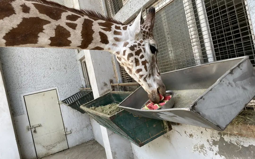午后的气温稍有升高,饲养员拿出了准备好的冰镇西瓜,迅速切块入盆,这西瓜不仅可以让长颈鹿们在降温的同时补充糖分和水分,还可以补充各类维生素和矿物质。
