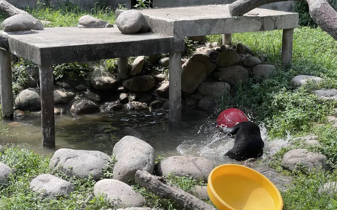 马来熊室外展区里有一处水池,里面装满了水,因此,戏水成了马来熊们的主要游乐项目。它们有的时候闭着眼睛泡在水池里,有的时候在水池里不停扑腾,溅起水花一片,一幅惬意的模样。