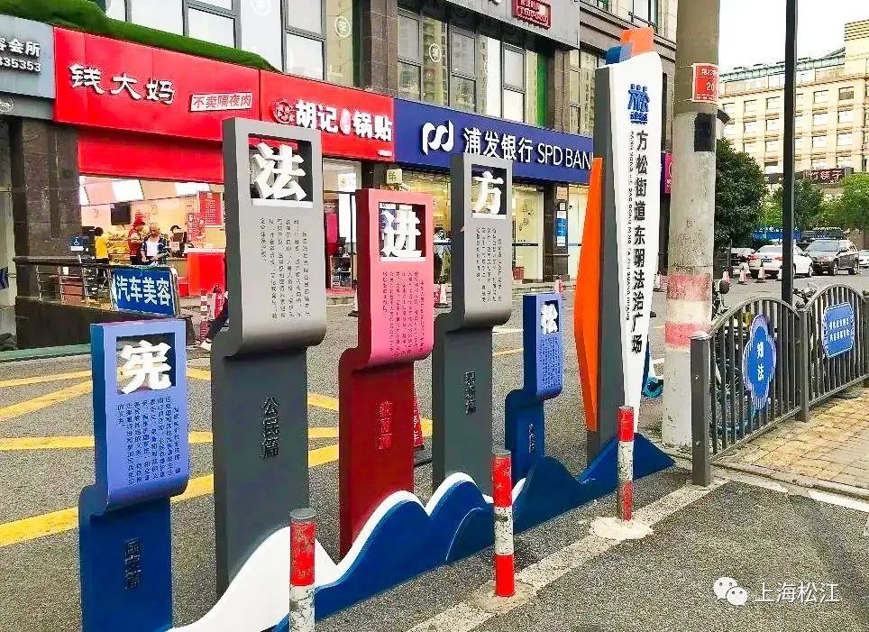 如今,走进广场,就是走进了普法宣传天地。广场入口处,一幅幅以法治为主题的宣传画结合了挡车柱、墙面、栅栏等设施进行设计,不仅宣传了法治,还美化了环境。远看可做景,近看可学法。宣传内容方面选取了营商环境相关的的诚信经营、消费者权益保护法等,既凸显了方松地区特色,又将其拓展为一个法治宣传阵地,逐步提升群众的法治文化品位。
