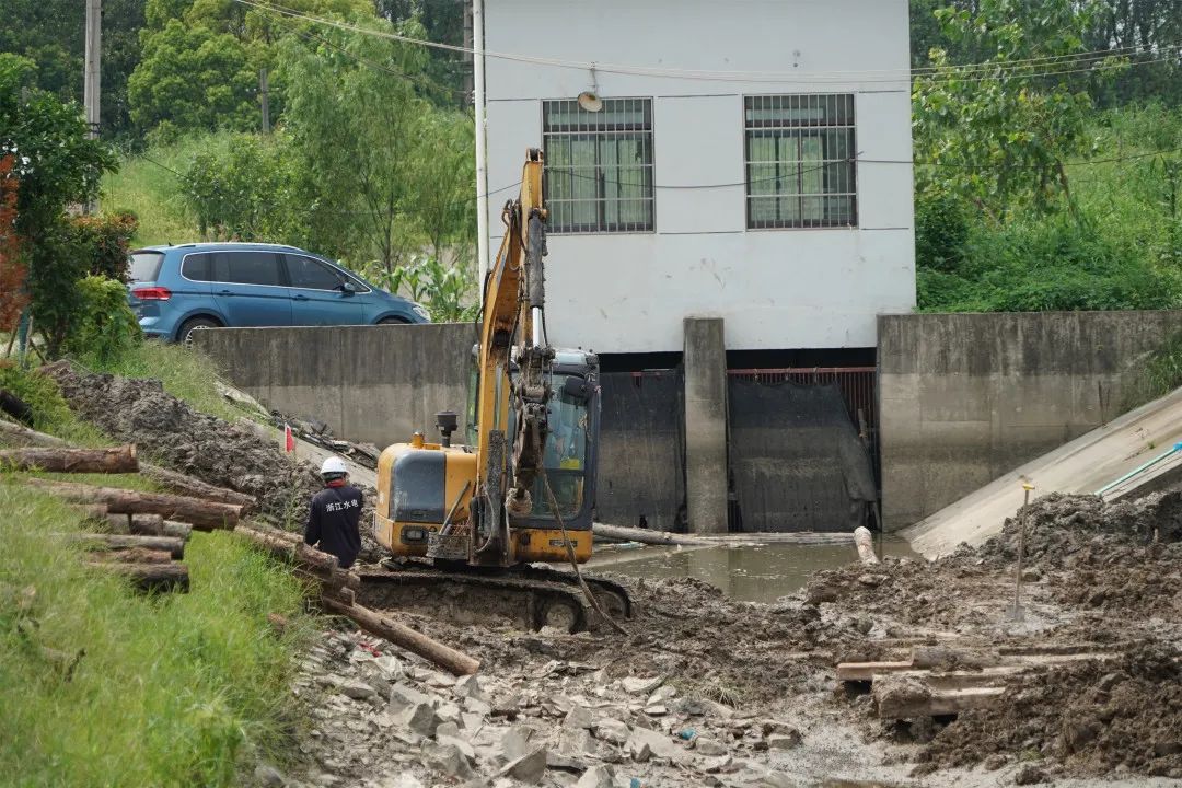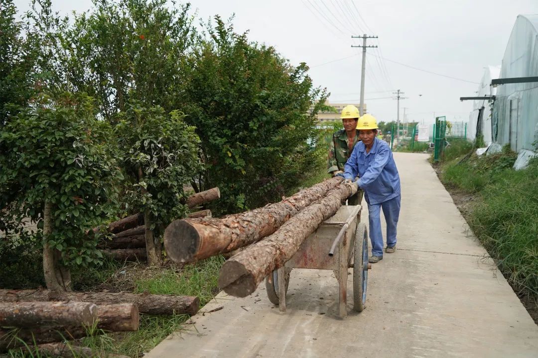 在年丰村李介舍河河道整治工程施工现场,工人们正将一根根木桩运到河岸边,待打桩完成后,将进行混凝土压顶,做好河岸斜坡,并在斜坡上种植绿化。