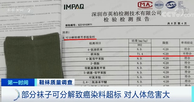 记者查阅检测报告时看到,国家相关强制性标准规定,可分解致癌芳香胺染料不得超过20毫克/千克,这款从直播平台购买的袜子,可分解致癌芳香胺染料达71毫克/千克。