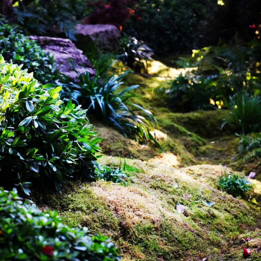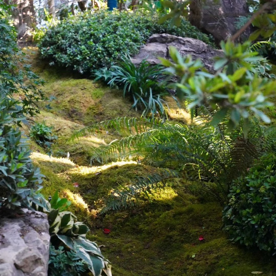 新设了两条台地园路,两侧点缀置石并种植苔藓等蕨类植物,创造上海第一个城市内部苔藓台地游园空间,构建了一个幽深静谧的溪谷微缩景观。