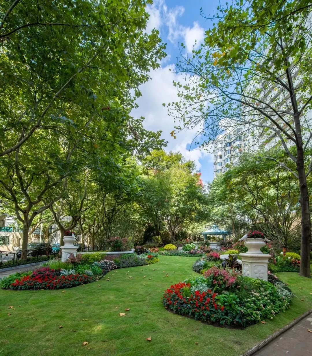 高安花园位于高安路、衡山路路口,在设计上结合了衡山路色叶元素,将其打造成具有法式风情的街心花园,为徐汇形成“一街一景、一路一色、一角一特”的可持续发展绿色社区作出了探索。