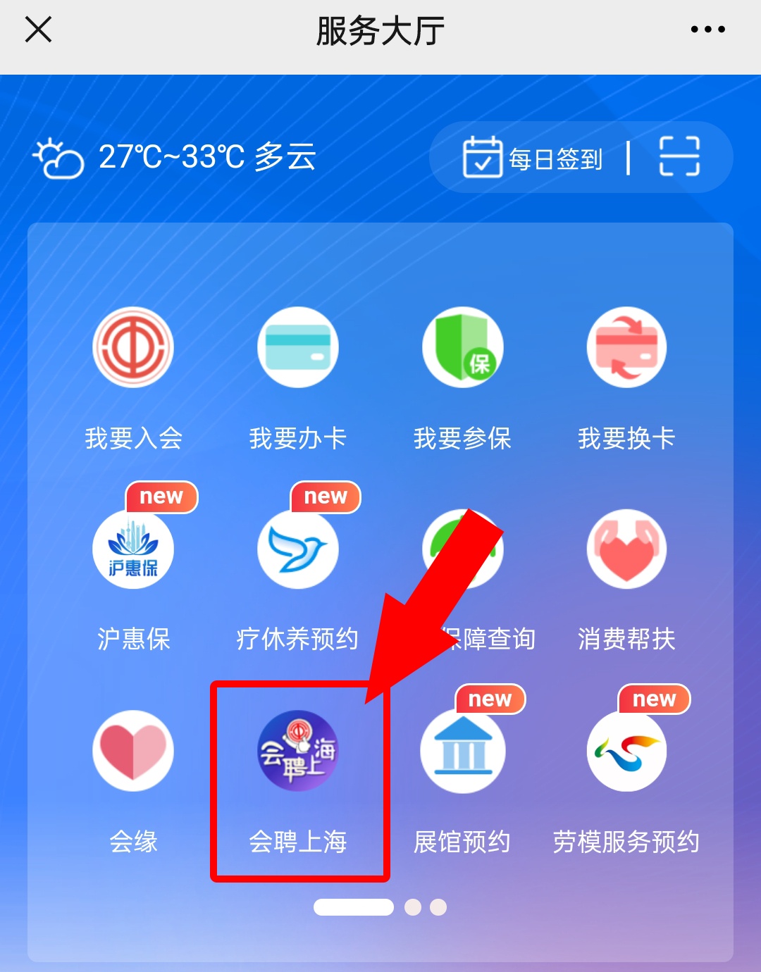 打开申工社微信【服务大厅】,找到【会聘上海】点击进入