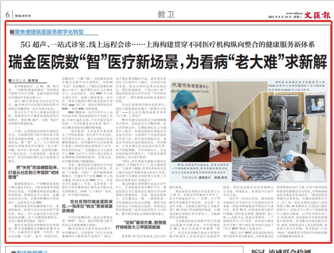 “通过‘空中MDT’在较短的时间内便可获得专家诊断意见,为患者量身定制更精准的治疗方案,有利于接诊医院和患者把握最佳诊治时机,实现疑难病症的异地会诊本地治疗。”瑞金医院党委副书记袁青对记者说,在建设国家医学中心、长三角一体化发展的过程中,瑞金医院将借力5G、AI等新技术,以推进代谢性疾病中心、高血压中心等六个疾病管理中心建设为载体,以专科专病为切入点,构筑高效、高质量和可负担的智慧医疗新场景,有效解决传统医院在时间、地域、资源和成本上存在的局限,使患者少些舟车劳顿、享受到家门口的“瑞金”,构建贯穿不同医疗机构纵向整合的健康服务新体系。