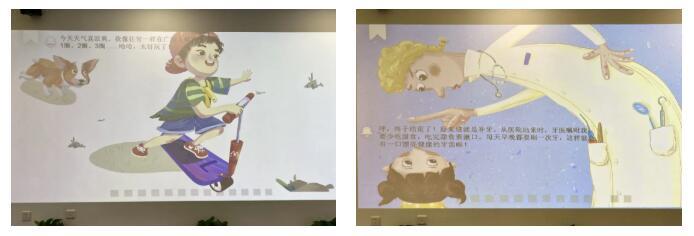社区文化活动中心的走廊也被充分利用了起来。这里创设了科学主题探索式阅读区,共有15本绘本供阅览,通过“AR+多媒体引擎软件+激光电子白板定位”来呈现,以创新的交互式数字阅读,打造AI光影阅读空间。孩子可以选择自己感兴趣的剧情,并参与互动,对孩子们的阅读自主性可以起到很好的培养作用。