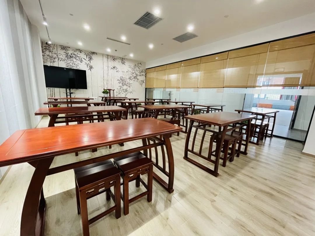 配备联网智能电视等多媒体设备、中式书画案桌,适合开展国画、书法等国学类课程。