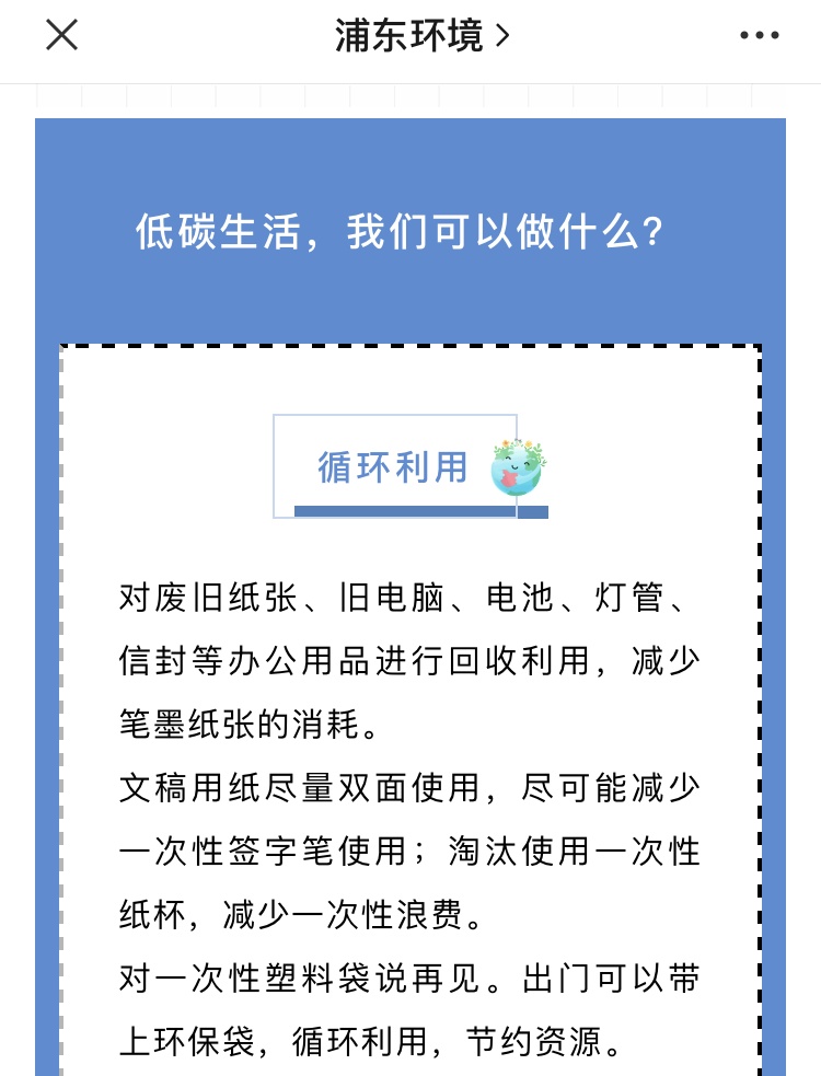浦东新区在全国低碳日提出了更详尽的低碳措施,从循环利用、绿色出行、节约粮食到节能环保应有尽有,为市民们开拓了低碳小事的思维,从而更好地由小到大、由浅入深将低碳进行到底!