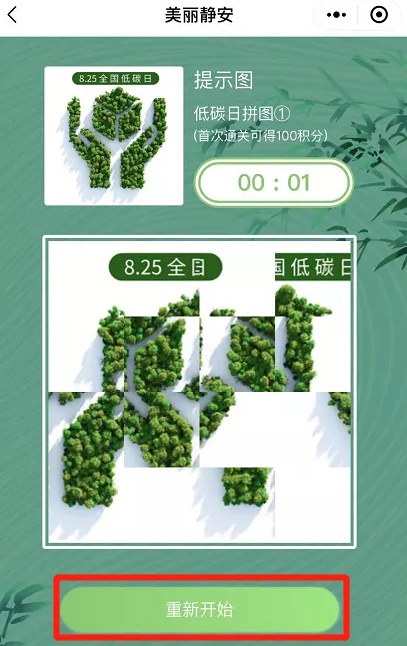 静安区为积极响应低碳宣传、践行低碳行动,推出低碳趣味拼图小游戏和低碳知识答题,引导社会公众对低碳生活的认知和理解,并认真践行绿色发展和低碳生活方式。该活动从2021年8月25日持续到2021年9月4日,还没有参与的市民朋友们快动起手来吧!