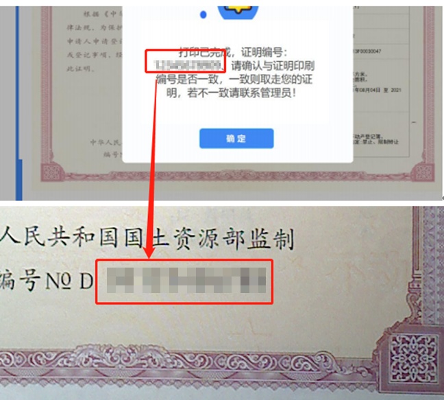 打印完毕后,请根据提示,核验编号一致后,再取走证书/证明。