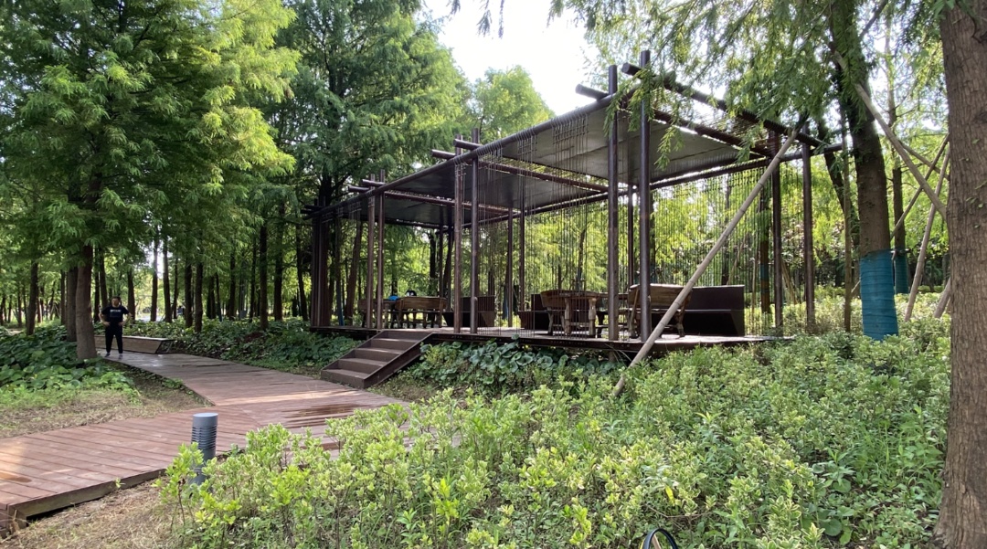林下庭轩采用了轻质钢材结构,配以木色漆面。粗放的钢材配件与生态林地展现了强烈的对比,而轻巧的结构、通透的设计使得小筑与自然浑然天成。在此小坐片刻,上有凉棚遮顶避免日晒,周有微风拂面,可赏景,可休憩,可发呆,此刻思绪与心境齐飞,美不胜哉!