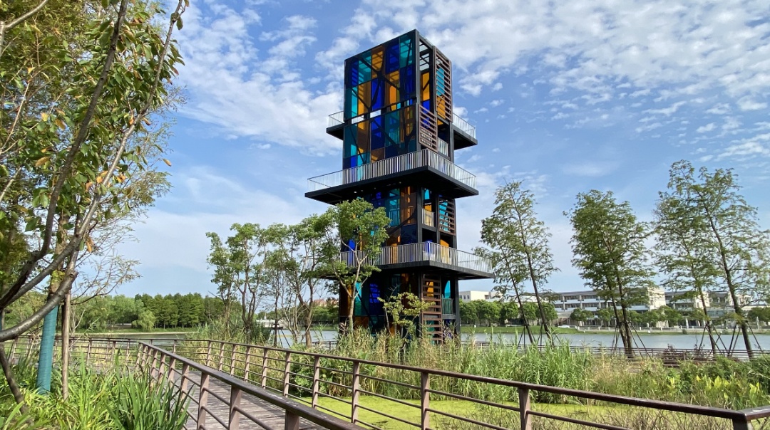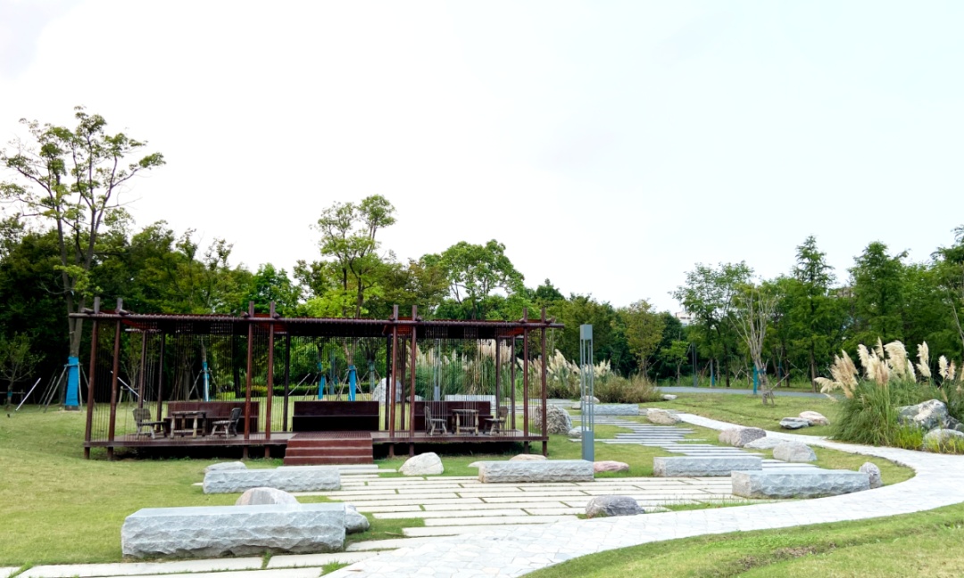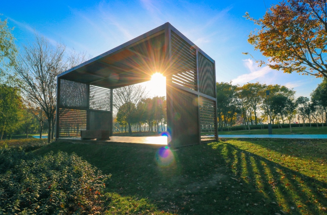 临港新片区二环城市公园建于2019年,公园与周边相邻社区和开放空间紧密相连,河流切分的各个地块呈现出不同的风貌和特色。随着二阶段桥梁竣工,公园绿道体系整体贯通,两公里公园带内绿树成荫、河流相连。设计共有8处小筑节点分布其中,所在点位各具特色。