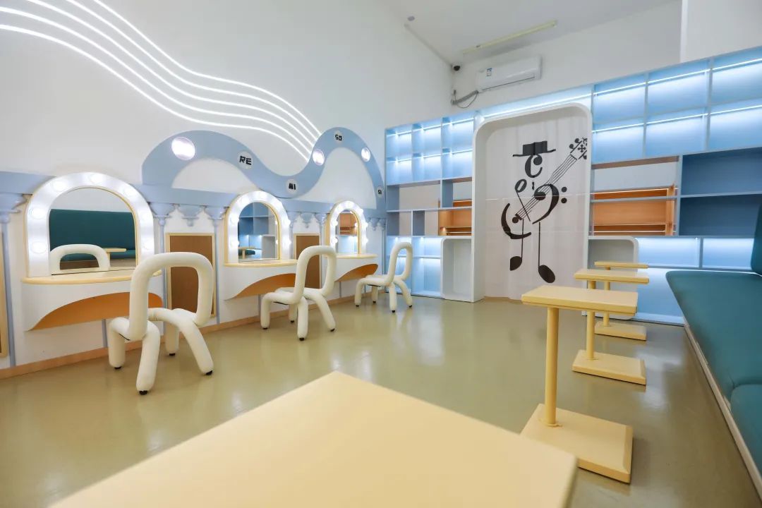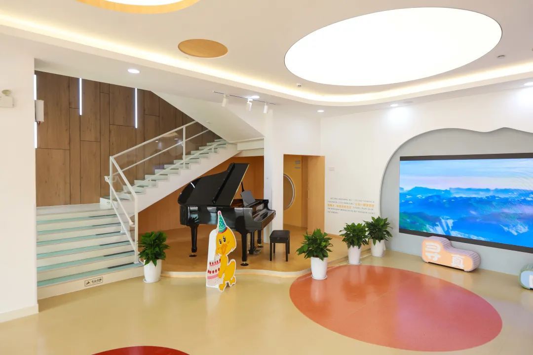 这个以音乐教育为特色的新园区,处处洋溢着艺术气息。院子里,樱花树下的轮胎秋千俏皮可爱;一楼的“乐动大厅”宛如一个小小舞台:黑色的三角钢琴、LED背景屏幕、可爱的“亲子换妆间”……连楼梯也会“唱歌”:孩子们的小脚每踩一级,都能听到不同的音符。