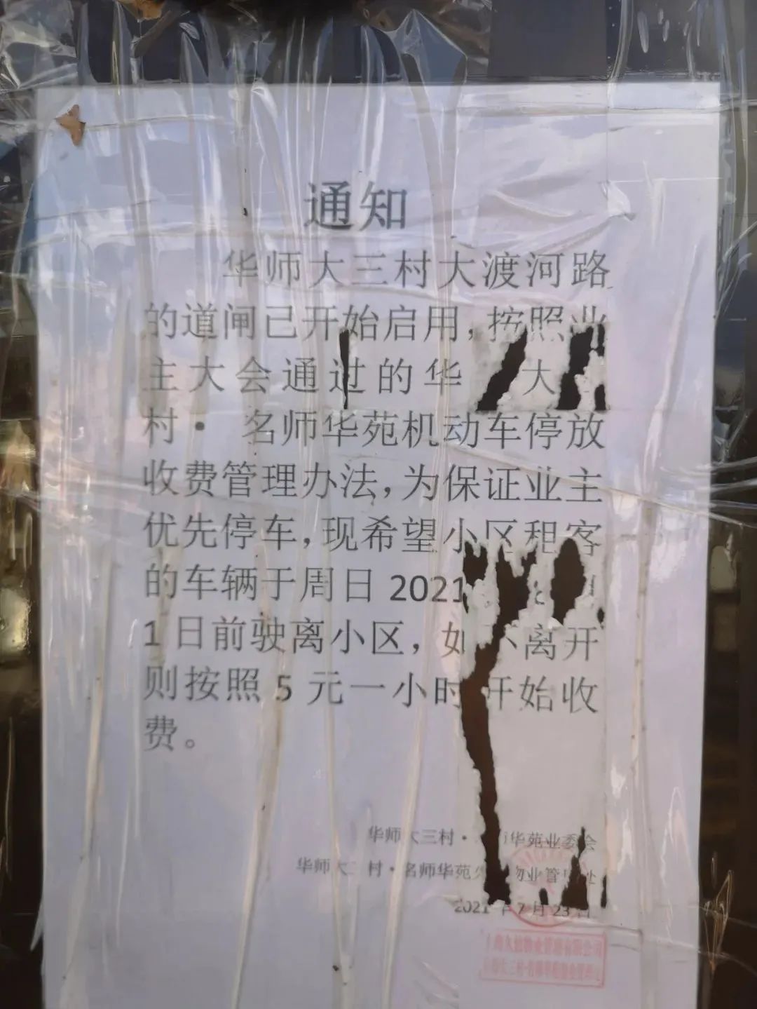 7月下旬,保安告诉王先生,物业贴出了一则通知,要求租户在8月1日之前将车驶离小区,否则将按照每小时5元的价格收费,一天封顶120元。