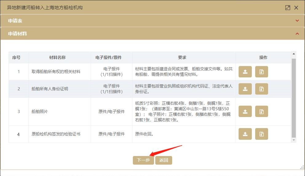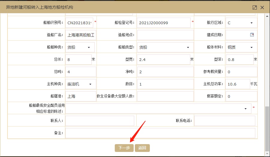 如申请船舶已取得《检验合格通知书》,系统将自动跳转至申请表页面。请如实填写申请表,点击“下一步”↓