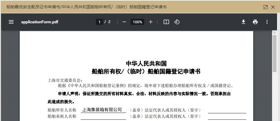 系统自动生成交通运输部海事局规定格式申请表单,申请人可根据需要打印《中华人民共和国船舶所有权/(临时)船舶国籍登记申请书》《船舶最低安全配员证书申请书》↓