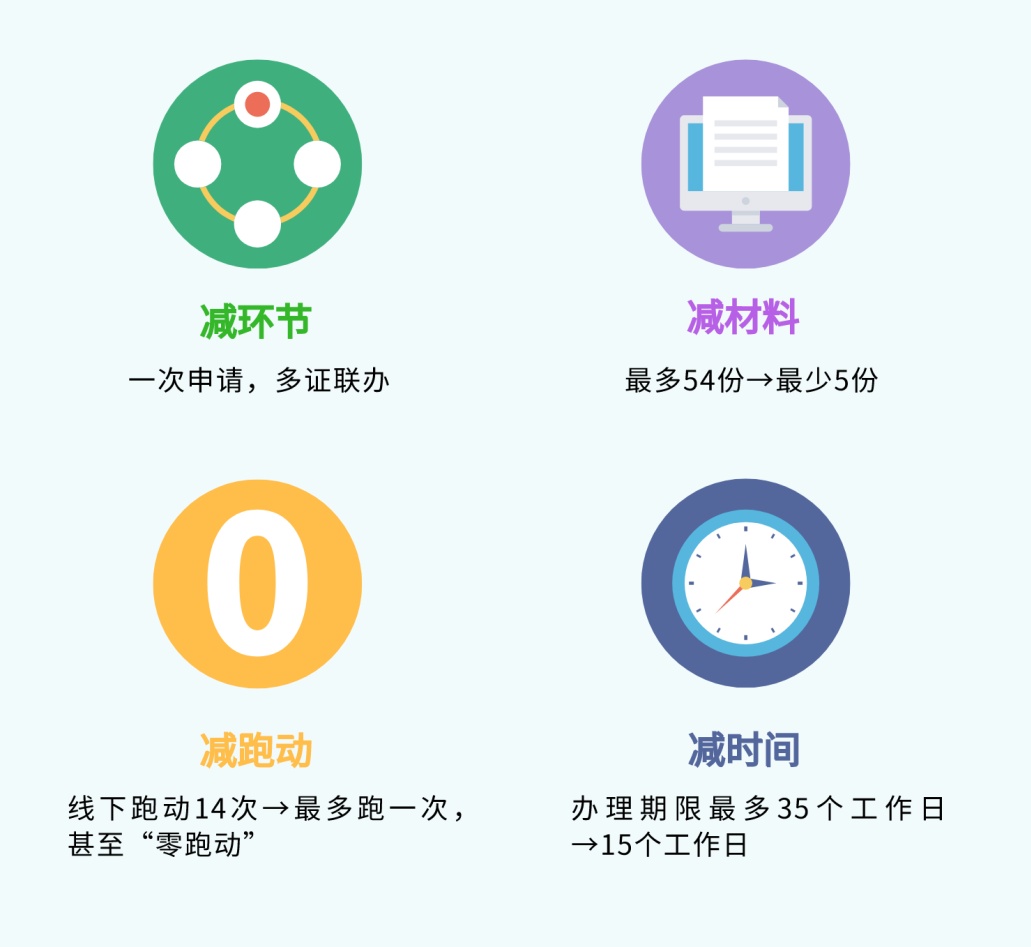 减环节,申请人一次申请,多证联办,实现环节最简、效率最高,大幅提升申请人办事体验度。