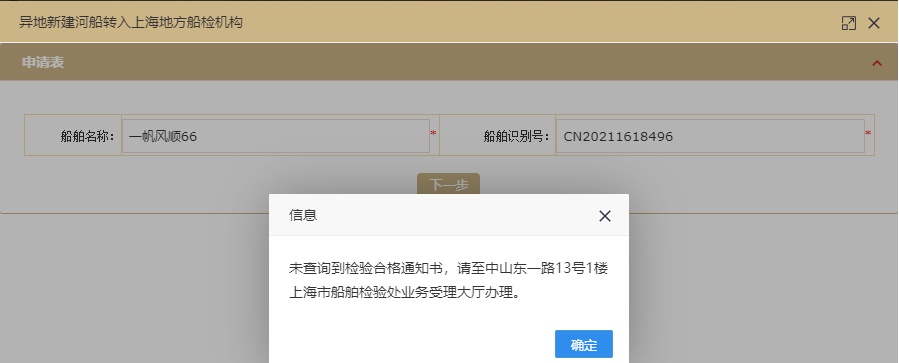 如申请船舶未取得《检验合格通知书》,系统将出现提示信息,请按提示信息办理↓
