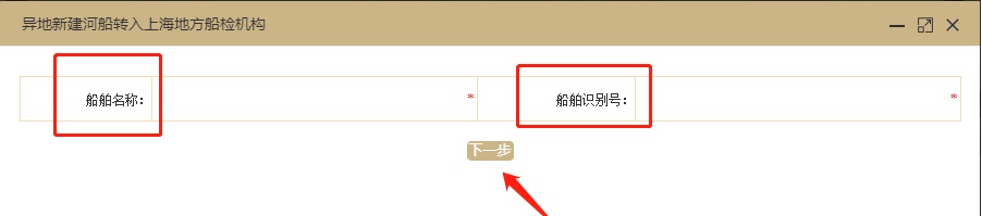 填写船舶名称和船舶识别号,点击“下一步”,系统自动查询申请船舶是否取得《检验合格通知书》↓