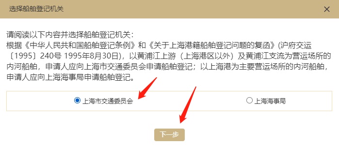 选择船舶登记机关“上海市交通委员会”,点击“下一步”↓