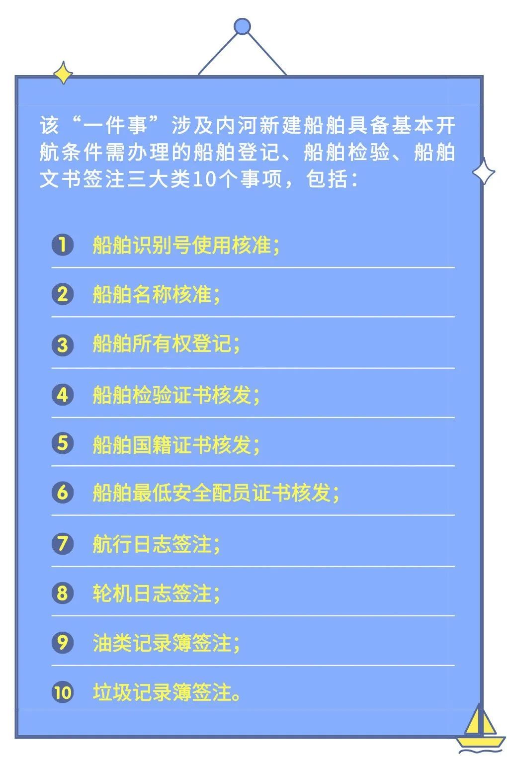 该“一件事”涉及内河新建船舶具备基本开航条件需办理的船舶登记、船舶检验、船舶文书签注三大类10个事项。通过业务流程再造,实现一次告知、一表申请、多证联办、一次办成,推动政务服务更加便利高效,提升申请人办事的便利度、满意度和获得感。