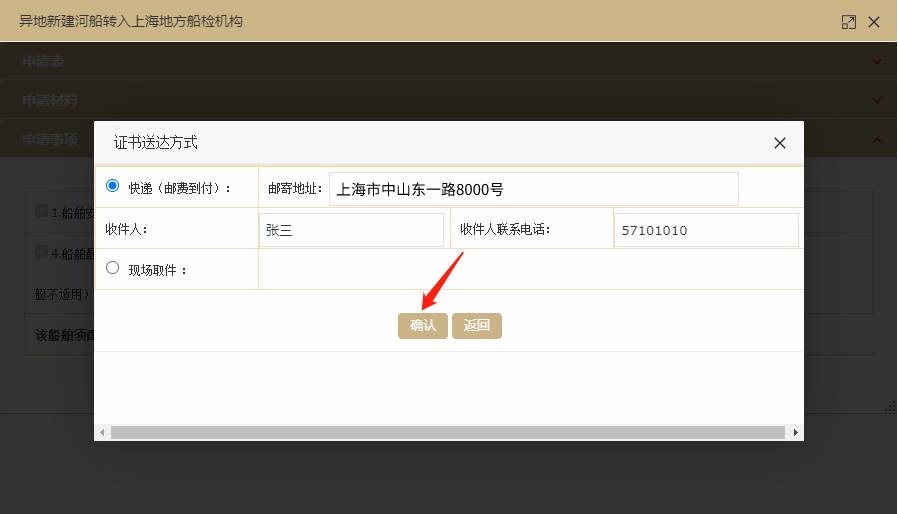 确认申请办理船舶检验证书核发、船舶所有权登记、船舶国籍证书核发、船舶最低安全配员证书核发事项。