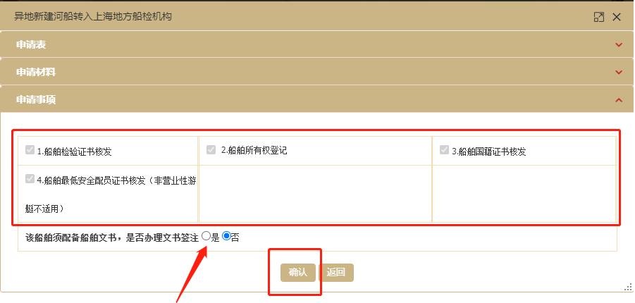 根据实际选择是否办理船舶文书签注。如办理签注,请选择文书签注种类,点击“确认”,提交申请↓