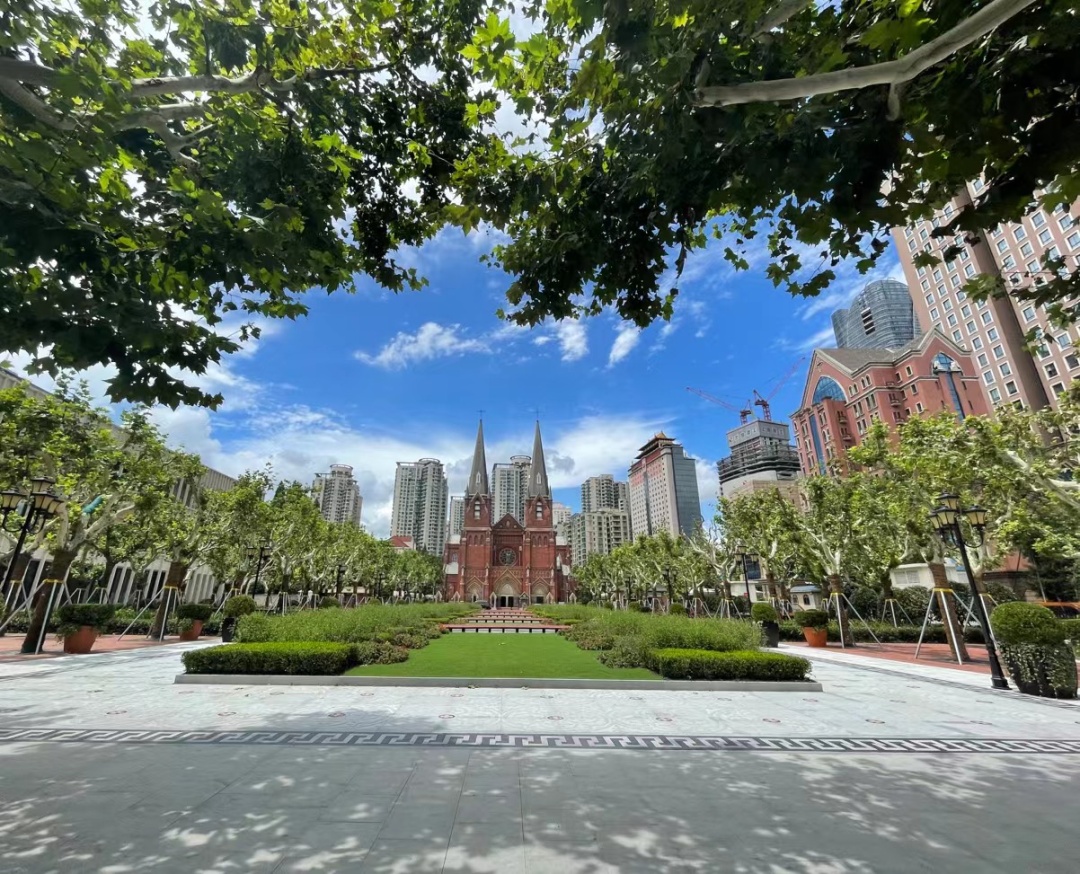 与市民阔别已久的徐家汇教堂广场近日对公众开放。作为徐汇区着力打造的最新“城市会客厅”,广场对原有空间重新设计整合,更好地展现了这一片的整体风貌。广场中央草坪两侧栽植悬铃木树阵,无论横向还是纵向,树阵都处于场地的黄金分割点处。