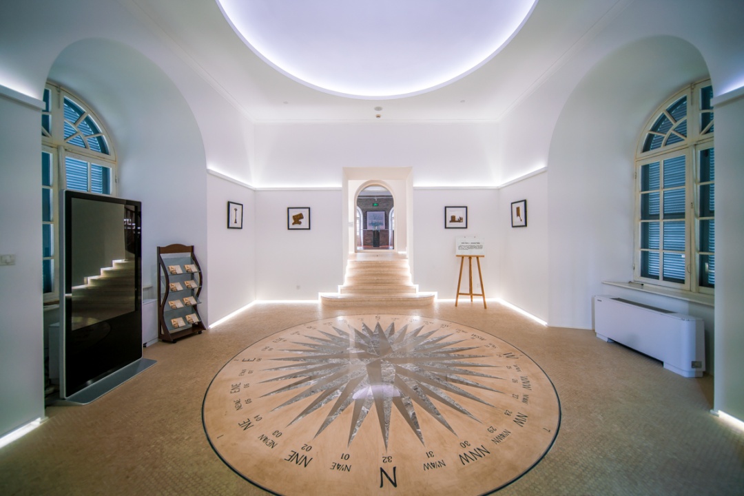 从二楼走进博物馆厚重的大门,地上内嵌32方位罗盘,专门请了专家进行测量,上面的东南西北就是目前的东南西北。气象对于远洋航运起着至关重要的作用,最早的气象服务就是服务于航海,罗盘就是用于航海上测量方位的,站在这枚巨大的罗盘中央喊话,会有惊喜哦!