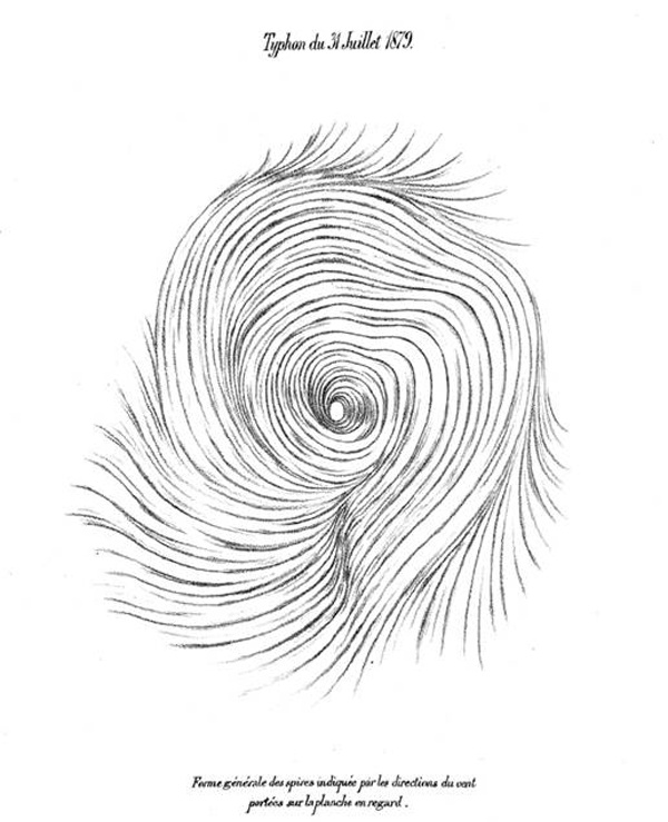 1879年上海遭强台风袭击,徐家汇观象台首任台长能恩斯通过分析沿海各灯塔站及周边各站的气象数据,预报了这次台风,从此拉开了中国天气预报的序幕。这幅手绘图让人不禁感叹,在人类尚且不能从太空俯瞰地球的年代,能够如此准确地绘制出台风眼,需要多么强大的想象力!