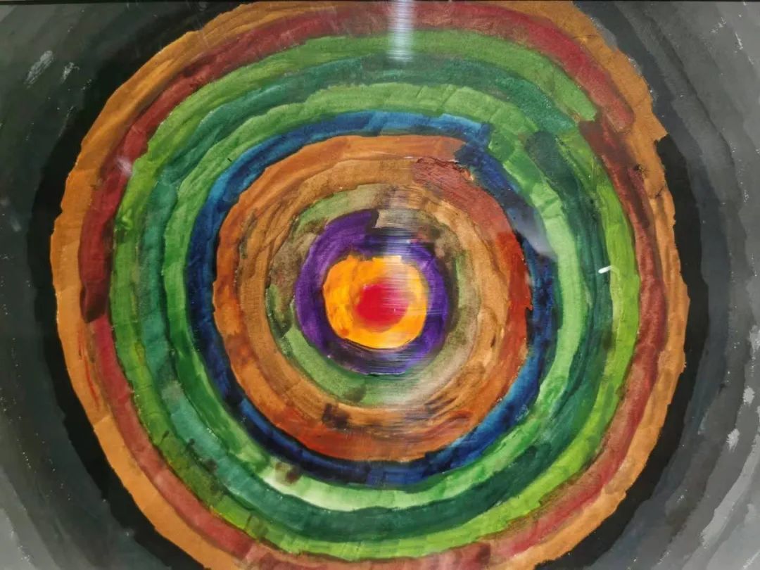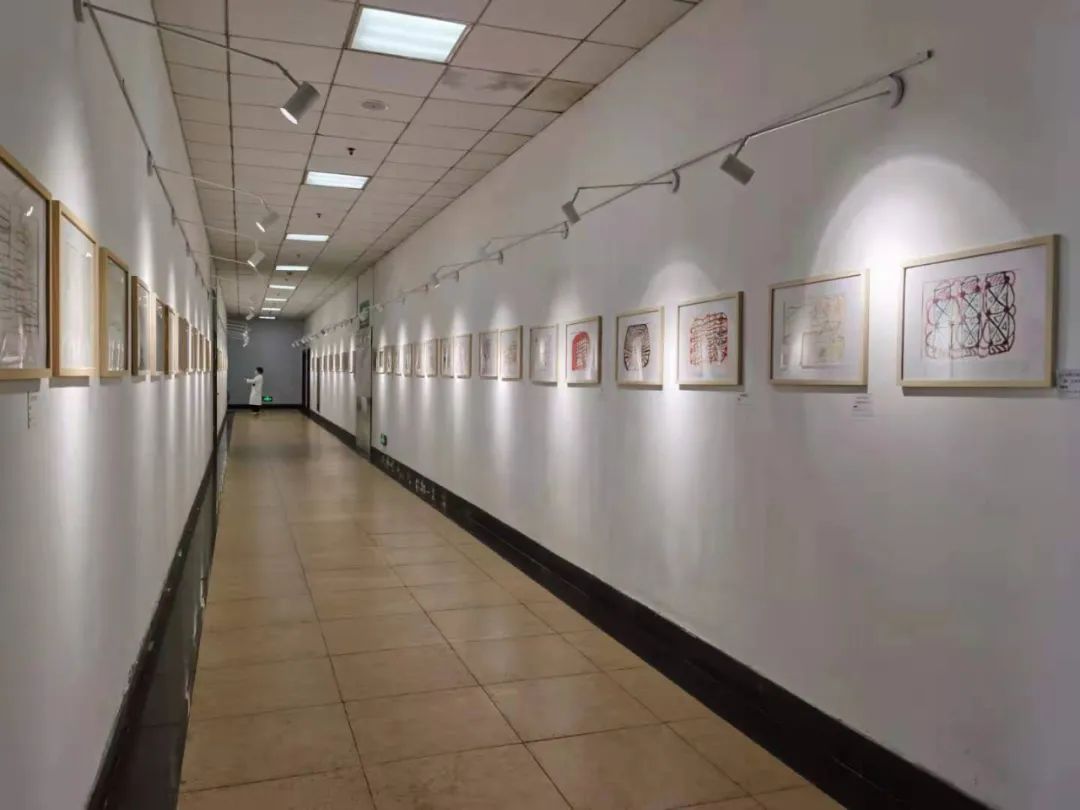 从宛平南路600号进入医院,右手边的6号楼1楼入口处,一个黑色背景下由圆心向外呈彩虹般色调的外螺旋状圆环,如靶盘,如声波,如隧道,构成“600号画廊”的醒目标识。
