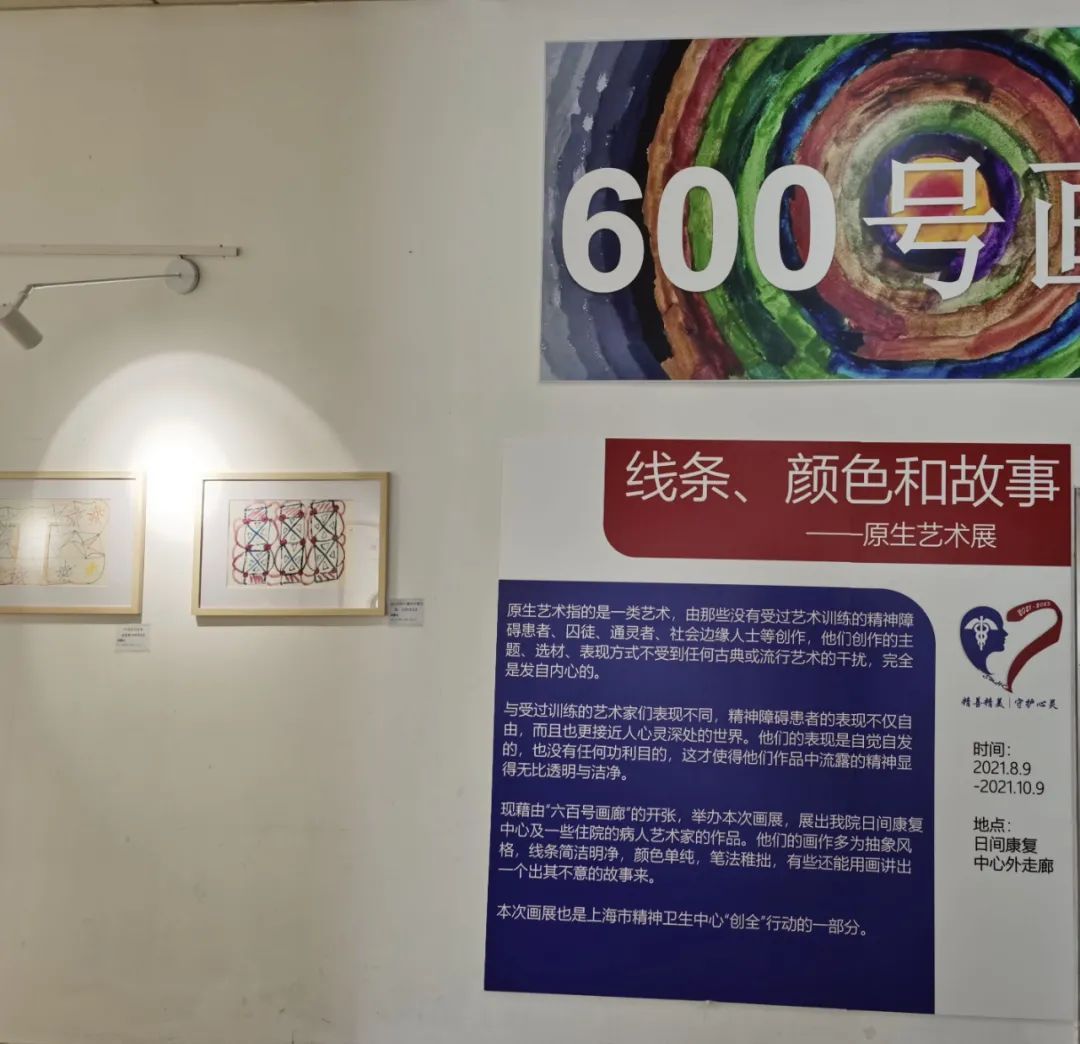 这里原来只是市精神卫生中心毗邻日间康复中心的一条简陋走廊,日常黑黢黢的,走在其间不知不觉会让人产生阴郁之感。如今,它被改造成为日间康复中心和长期住院的精神病人画作的展览空间,8月9日起对外开放。15位病人、60幅原生艺术作品,因作品多为抽象风格,线条简洁明净,色彩单纯,却又蕴涵引人遐想的故事空间,600号画廊的首期画展被命名为“线条、颜色和故事”。医生鼓励地称这些作品的创造者为“病人艺术家”。