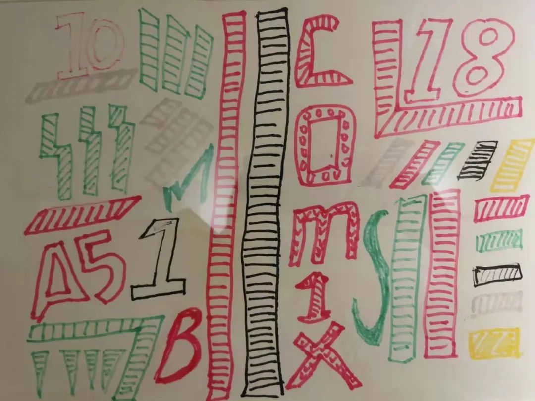 在一幅题为《学习英语和数学的必要性》的作品中,一些字母和数字,其实是病人一个笔记本上的一些符号,他把它们打碎了,重新组合起来。关于作品的名字,病人自己解释说,因为在这个笔记本的封面元素中,只有字母和数字,所以他联想到了英语和数学。据介绍,这位病人手头有好几个笔记本,其中有一本很破旧的笔记本上面,密密麻麻地写了他最近二三十年里创作的所有的诗歌,而且他特别珍惜自己的创造力,把自己的创作都一五一十地保存了下来。他有好几本笔记本,画中呈现的是其中一本笔记本的封面。