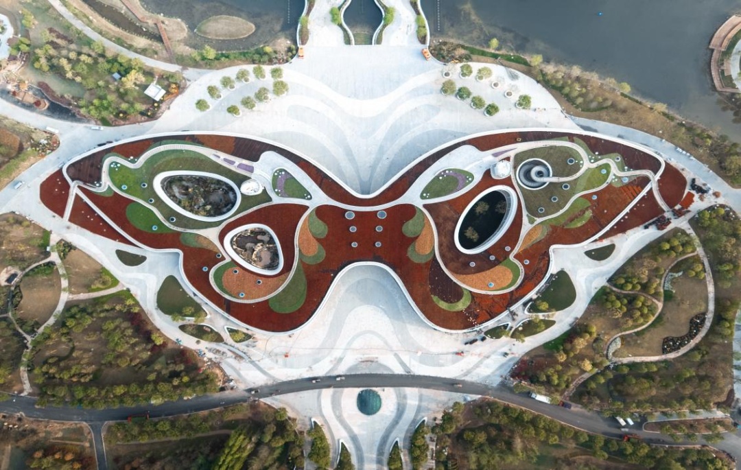 花博会期间,复兴馆内游人如织。该馆融合中国的剪纸、折纸概念,融合传统建筑的柱廊、檐廊等元素,采用中国古典坡屋顶和柱廊为架构,层叠激荡的坡屋面寓意复兴之路波澜壮阔的历程,同时也暗合了花博园这片土地承载的艰苦奋斗历史。